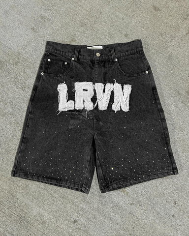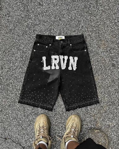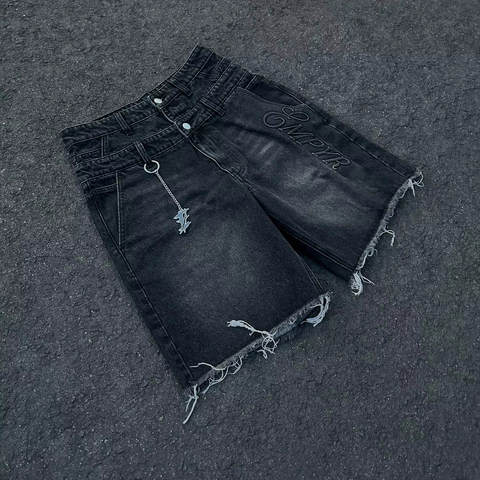 Yingling กางเกงยีนส์ลายนูนแนวสตรีทแวร์แนววินเทจผ้าคาดเอวสองชั้นผ้ายีนส์ซักความเป็นกรดกางเกงยีนส์ขาสั้นปักลาย3D สำหรับผู้ชาย