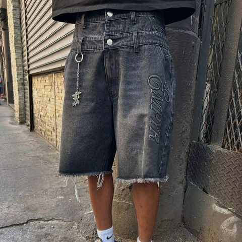 Yingling กางเกงยีนส์ลายนูนแนวสตรีทแวร์แนววินเทจผ้าคาดเอวสองชั้นซักแบบดิบขอบกางเกงยีนส์ขาสั้นสำหรับผู้ชายปักลาย3D